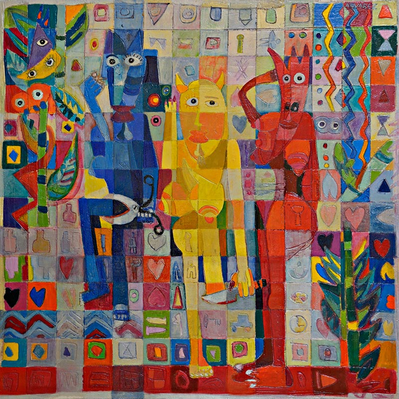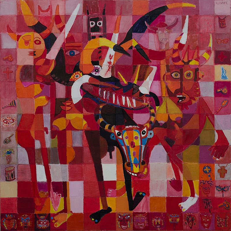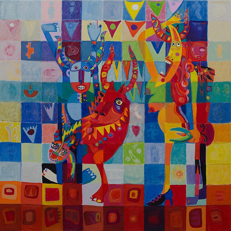 La trama reticulada, sigue siendo constante en mi obra, es el principio estructural para instalar un complejo sistema casi pictográfico. Este ordenamiento sistemático que provoca la percepción en mis trabajos, lejos de ser mera representación, me produce la creencia al mundo mágico-religioso; de las experiencias y prácticas que atesoran el rescate de tradiciones orales. Reconquistar el sentido de las fiestas y los rituales, actualizando sus usos y costumbres en la sociedad.