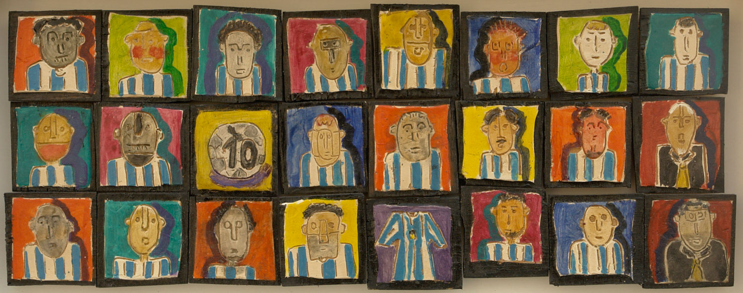 Gabriel Alvarez desarrolla la temática deportiva provocando una reflexión que surge del sentimiento y la pasión que genera el fútbol. El universo masculino está representado por la hinchada y su amor a la camiseta. Los diferentes colores aluden al anhelo de pertenecer a una sociedad en la que sea posible convivir en las diferencias. Los personajes quedan unidos por sus rostros de figuritas infantiles. Con la esperanza intacta abren los ojos y juntan aliento para vivir el momento donde comienzan los sueños. Son los pibes del potrero, expresión del barrio, fieles seguidores de su equipo acompañándolo con toda la parafernalia que los identifica, aguardando el encuentro con el toque mágico de la pelota, los cambios de ritmo, las gambetas, las piernas como poseídas, el descubrimiento de la libertad en los pies. Como un culto pagano que domingo a domingo se celebra con pasión, así el fútbol se convierte en espectáculo ritual y se erige como la nueva religión planetaria que convoca a multitudes. Pero Álvarez sabe que el fútbol bien puede complementarse con el arte. Ante la genialidad de una jugada, la estética del balompié logra sensibilizar a miles de personas bordeando las fronteras con el arte. Para el artista, ése es el mejor partido; para el contemplador es una manera inédita de ingresar a una cultura de expresión multitudinaria.